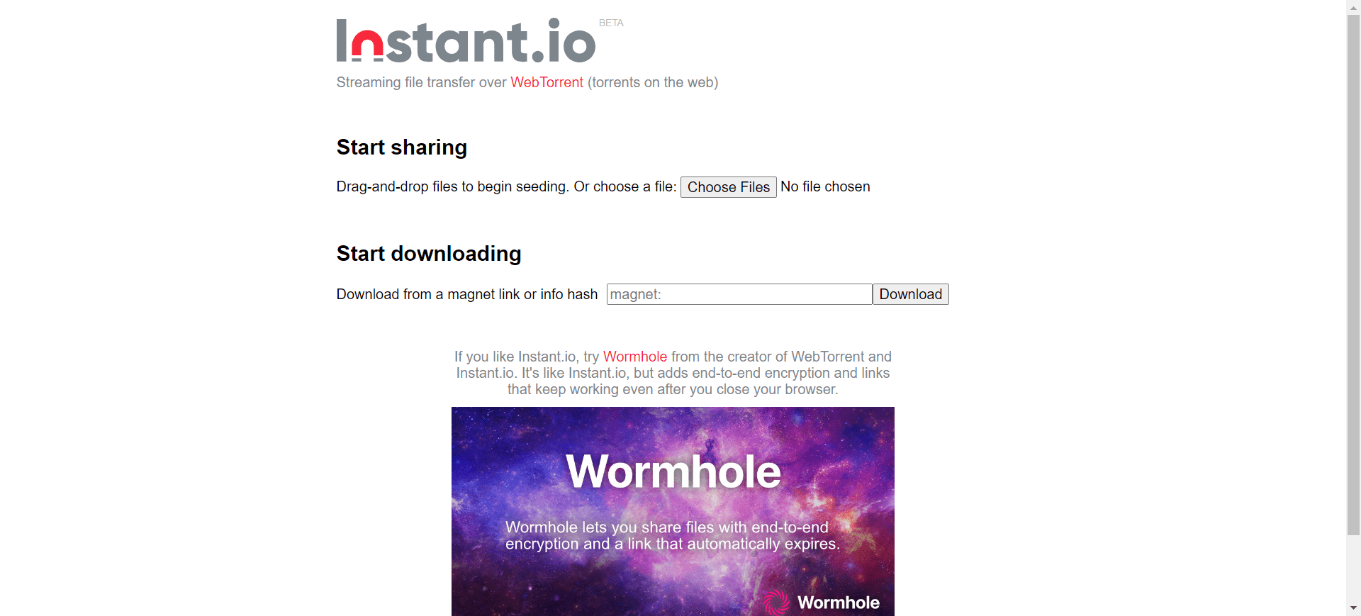 Web Wormhole یک سرویس رایگان و آسان برای انتقال فایل بین دستگاهها است. کافی است یک کد Wormhole ایجاد کرده و آن را با دوست خود به اشتراک بگذارید تا اتصال برقرار شود و بتوانید فایلها را به اشتراک بگذارید.