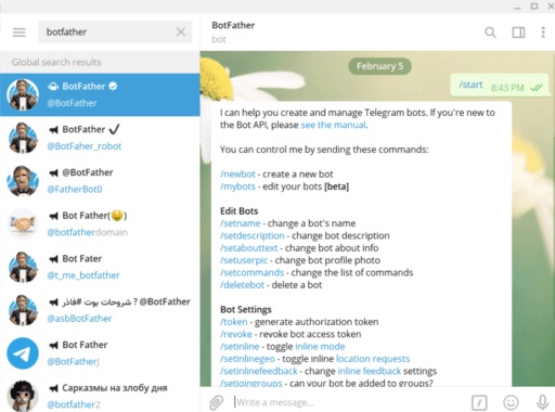 برای راهاندازی یک مکالمه و دریافت پاسخ باید /start را در BotFather تایپ کنید. در ادامه یک لیست از دستورها را دریافت خواهید کرد.