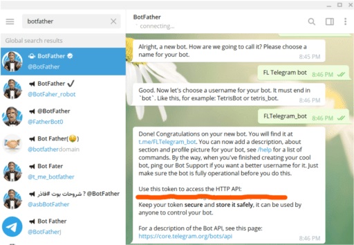 دستور /newbot از شما میخواهد ربات خود را معرفی کرده و یک نام کاربری برای آن تعیین کنید. در حقیقت نام موردنظر همان چیزی خواهد بود که مخاطبین در یک مکالمه خواهند دید؛ آنها ربات را از طریق نام پیدا خواهند کرد؛ توصیه میکنیم یک نام دوستانه برای ربات خود تعیین کنید. توجه داشته باشید که شرایط برای نام کاربری متفاوت خواهد بود. هنگامی که نام کاربری را وارد میکنید، نباید میان آنها فاصله وجود داشته باشد و لازم است پسوند bot را در انتهای آن قرار دهید. همچنین نام کاربری بین 5 الی 32 کاراکتر بوده و میتواند شامل حروف لاتین، اعداد یا خطوط باشد. همانطور که در تصویر مشخص است، ما برای ربات خود نام کاربری FLTelegram_bot را انتخاب کردهایم.